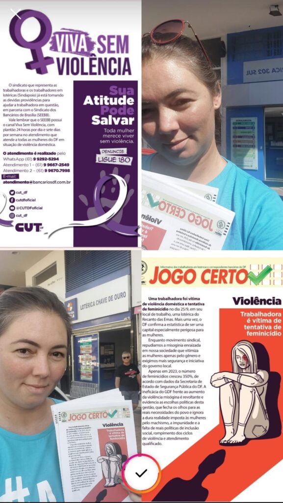 No último dia 26 de setembro, o Sindicato dos Bancários, junto com o Sindapoio e a CUT, publicou nota de repúdio à tentativa de feminicídio em lotérica no Recanto das Emas. No documento, além de cobrar medidas efetivas do Governo do DF para combater o aumento dessa violência misógina, foi divulgado o canal de atendimento Viva sem Violência.