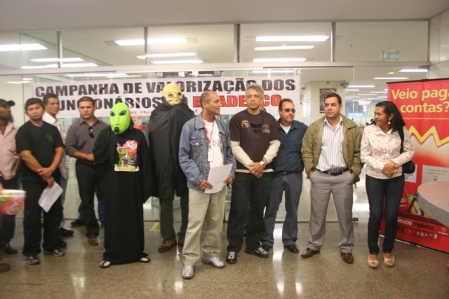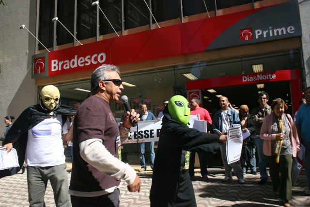Numa alusão à campanha publicitária Bradesco Banco do Planeta, o Sindicato colocou alienígenas distribuindo notas à população, explicando a intransigência do banco em negociar com os trabalhadores. Os sindicalistas informaram aos clientes e usuários os motivos da paralisação e pediram compreensão e apoio. O Bradesco se preocupa com campanhas para salvar o planeta, mas esquece de atender necessidades básicas de seus funcionários, critica José Garcia, diretor do Sindicato e funcionário do Bradesco.