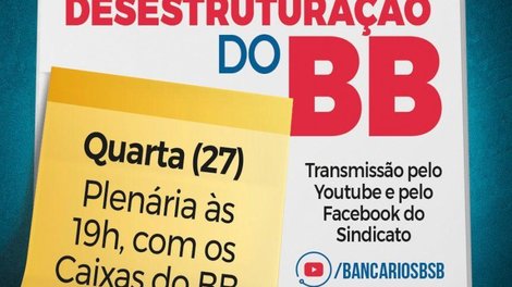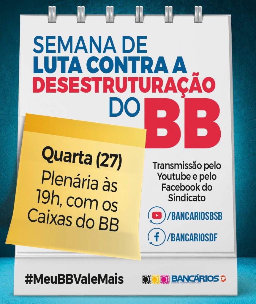 Nesta quarta-feira (27), o Sindicato dos Bancários de Brasília realizará plenária com os Caixas do Banco do Brasil (BB). A reunião acontece às 19h e será transmitida pelas redes sociais do Sindicato.
