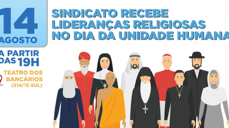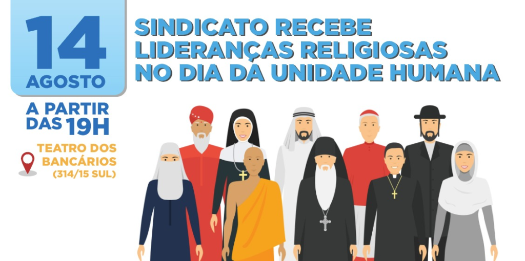 A partir das 19h da próxima segunda (14), o Sindicato realiza um ato inter-religioso com lideranças de diversas religiões para celebrar o Dia da Unidade Humana. O encontro aponta para a construção coletiva por “respeito e fraternidade, em vez de intolerância e fundamentalismo”, como descreve o mote do evento. O ato é organizado pela Secretaria de Políticas Sindicais do Sindicato e será realizado no Teatro dos Bancários.