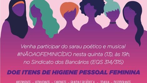 O Sindicato vai receber nesta quinta-feira (13), a partir das 19h, o 'Sarau Não ao Feminicídio'. O Sindicato é um dos parceiros do evento, promovido pelo Celeiro Literário Brasiliense e pelo Projeto BraSa – Caminhos Literários e Musicais entre Brasília e Salvador, que vai reunir poetas e músicos de Brasília para denunciar as violências físicas e simbólicas contra a mulher.