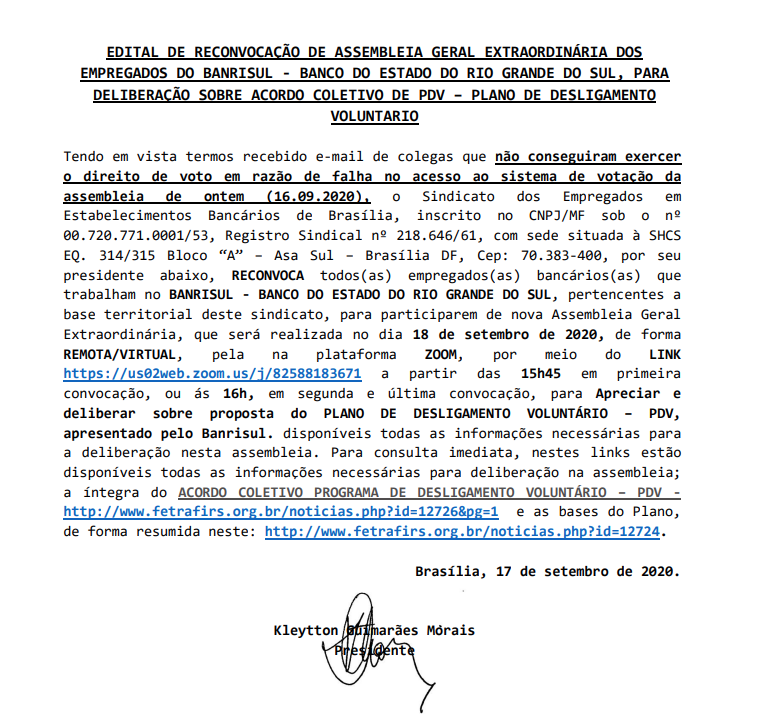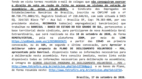 Por conta de problemas técnicos, o Sindicato reconvoca os bancários do Banrisul para nova assembleia extraordinária remota, a ser realizada nesta sexta-feira (18), para deliberar sobre a proposta de plano de desligamento voluntário (PDV) apresentada pelo banco.