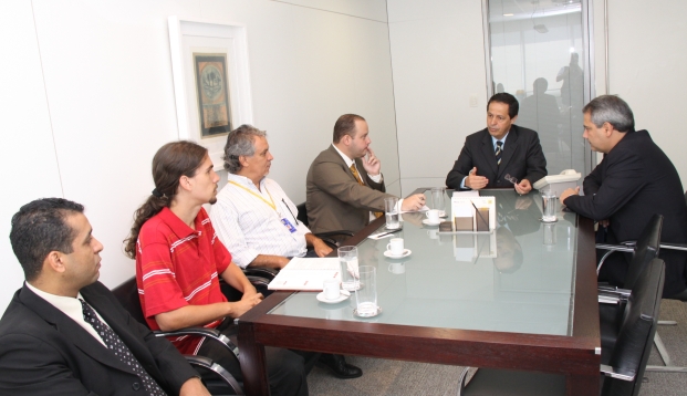 Eduardo Araújo, Rafael Zanon, José Pacheco (Fetec/CN) e Rodrigo Britto, em reunião com Robson Rocha e Carlos Neri, do BB