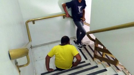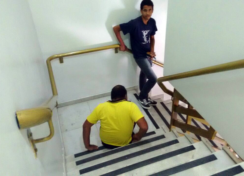 Uma situação absurda foi flagrada, nesta quinta-feira (5), durante uma visita habitual do Sindicato dos Bancários de Brasília à agência do Banco da Amazônia de Brasília. Devido à falta de acessibilidade, um deficiente físico foi obrigado a se arrastar pelas escadas para ter acesso ao atendimento no primeiro andar da agência.