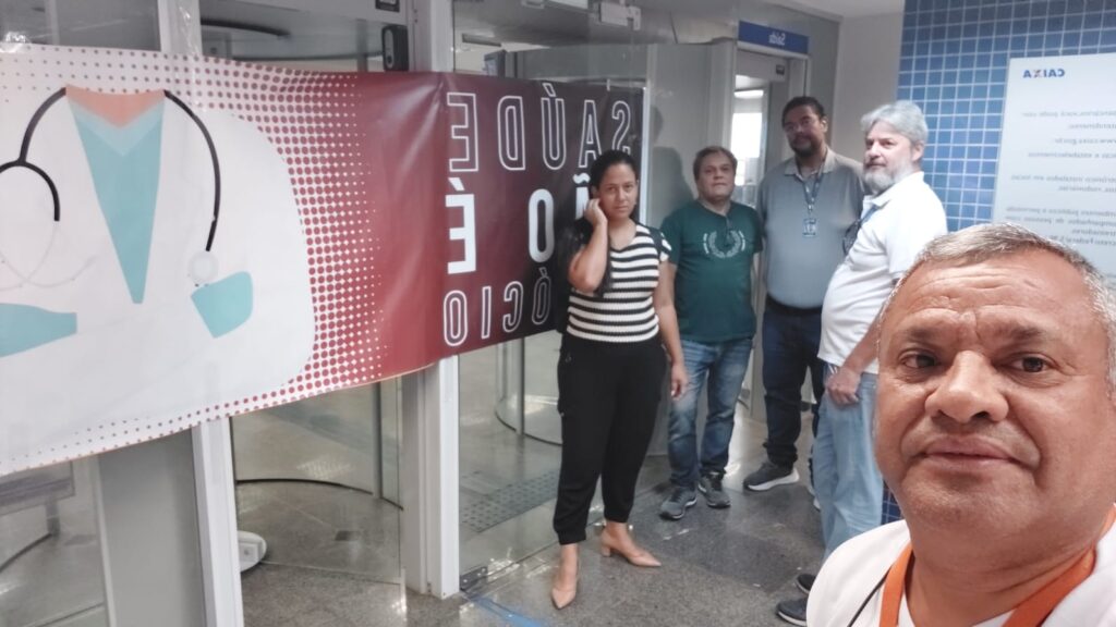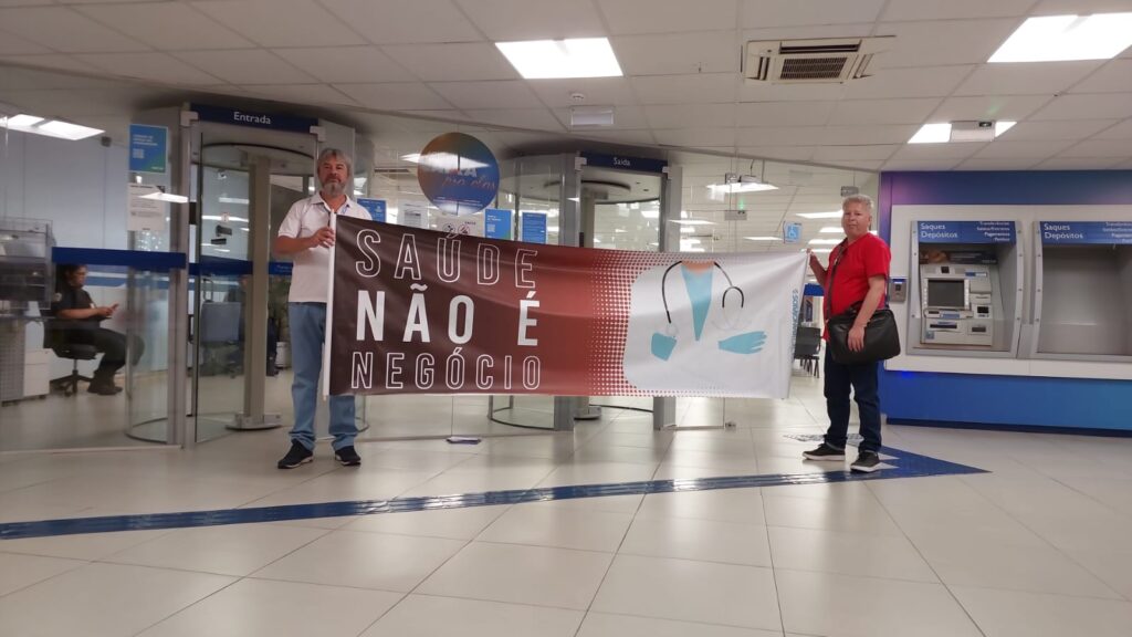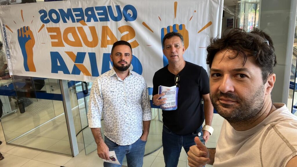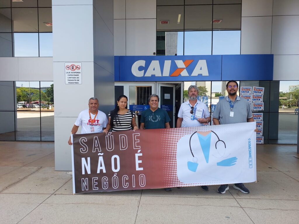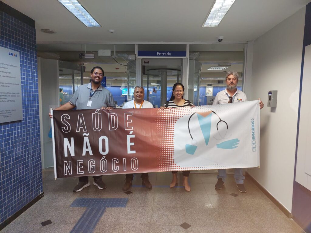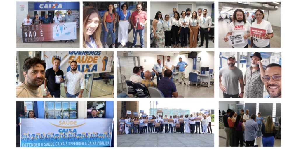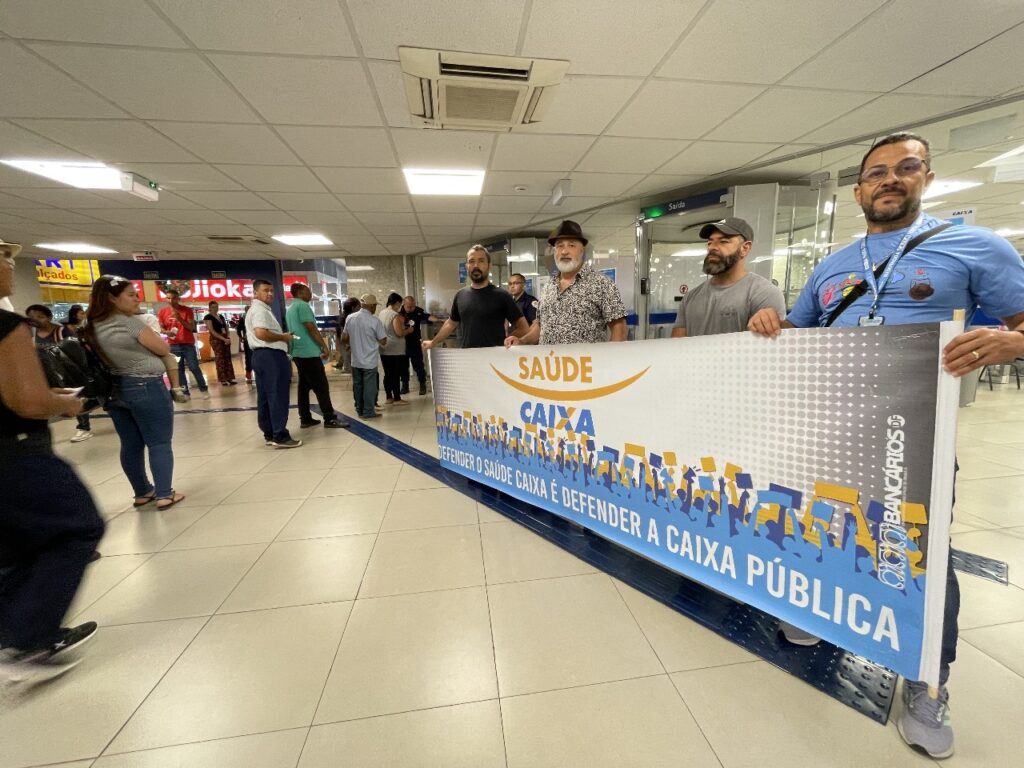 Empregados e empregadas da Caixa em todo o país voltaram a protestar, nesta segunda-feira (30), em mais um Dia Nacional de Luta em Defesa do Saúde Caixa. As manifestações são uma resposta ao endurecimento do banco nas negociações para a renovação do ACT do plano e foram marcadas pelo retardamento da abertura de agências em 30 minutos, em referência ao pedido de manutenção de apenas 30% dos custos do benefício a serem pagos pelos empregados.