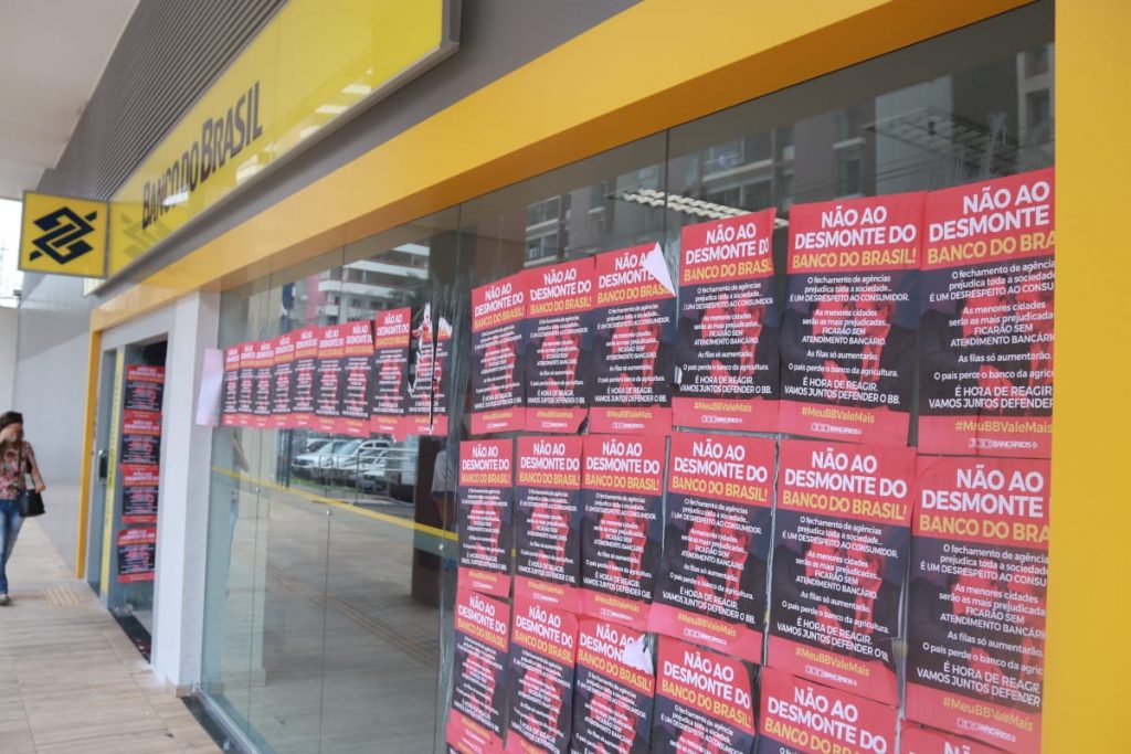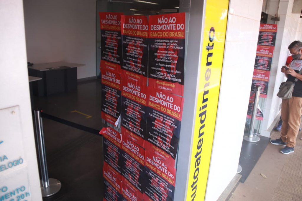 Na madrugada desta sexta-feira (22), o Sindicato dos Bancários de Brasília realizou colagem de cartazes e faixas nas principais agências do Banco do Brasil no Plano piloto. O conteúdo exposto no material denunciou os riscos que a reestruturação da instituição representa aos servidores e ao atendimento prestado à população.