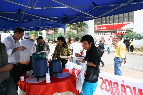 Ao som da banda Fanfarra do Sindicato e com a animação de artistas, palhaços e mímicos, foram servidas mais de 700 refeições em frente ao Bradescão.