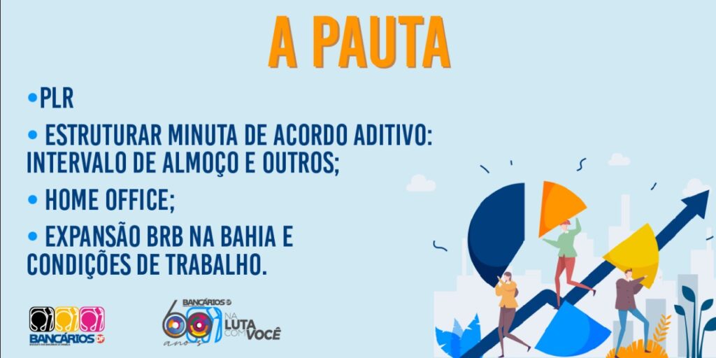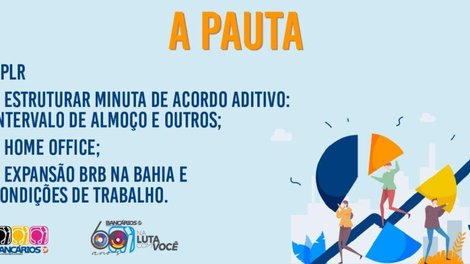 O Sindicato se reúne em mais uma mesa de negociação com o BRB, nesta tarde de quinta-feira (9), para discutir assuntos de interesse dos funcionários, como PLR, estruturação da minuta de acordo aditivo em relação a intervalo de almoço, por exemplo, home office, expansão do BRB na Bahia e condições de trabalho.