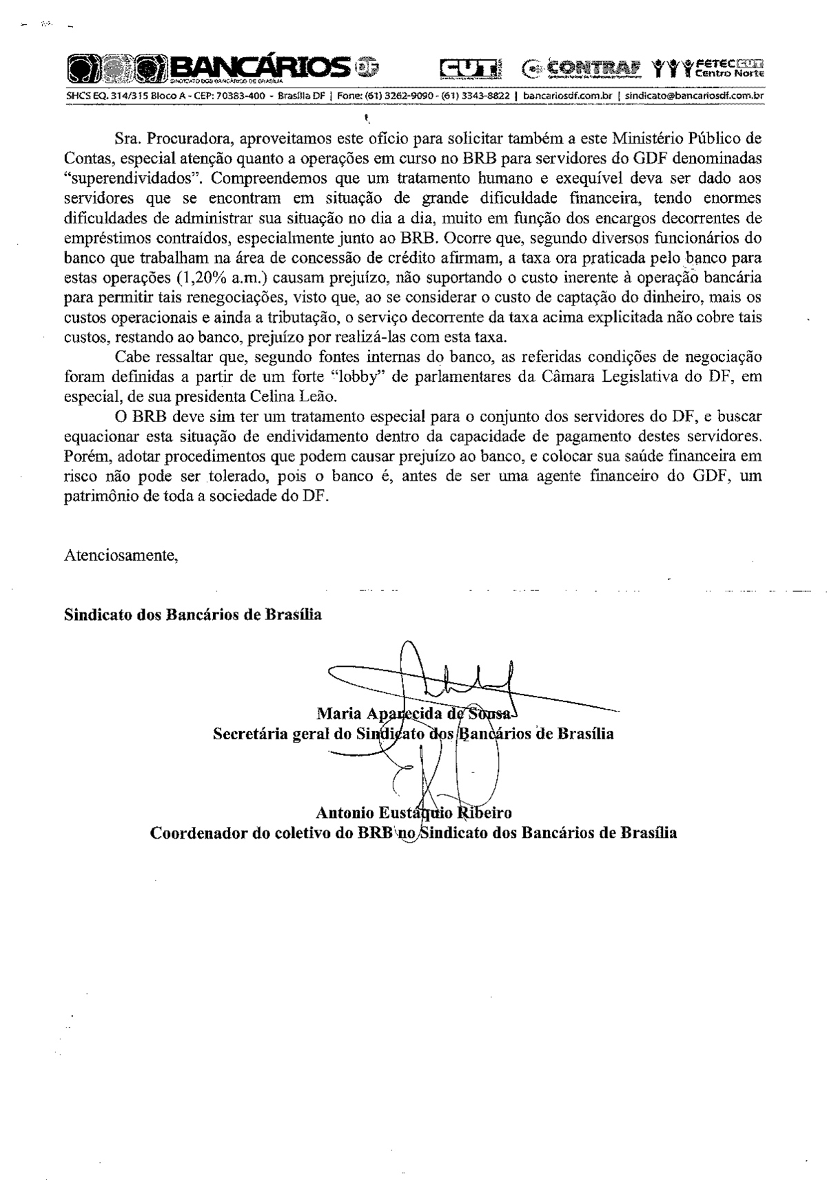 O Sindicato protocolou nesta quarta-feira (4) no Ministério Público de Contas do DF pedido de investigação a respeito de diversas denúncias que têm sido veiculadas por órgãos de mídia de Brasília que envolvem o BRB e a Cartão BRB.