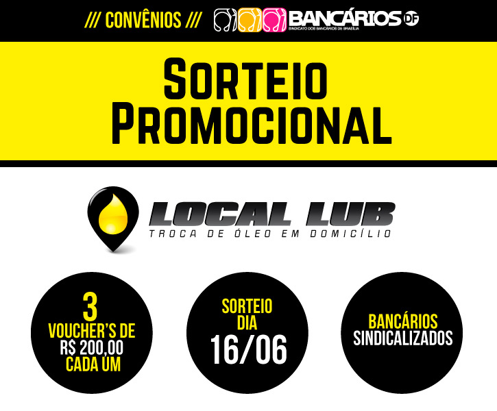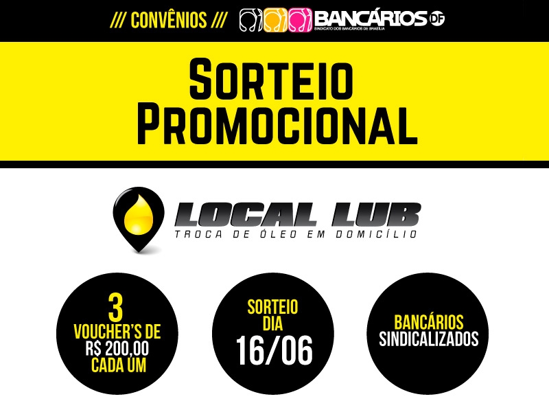 O Sindicato está com inscrições abertas aos sindicalizados para o sorteio promocional de três vouchers individuais, no valor de R$ 200 cada, a ser utilizado como desconto máximo em qualquer um dos serviços oferecidos (veja relação abaixo) pela Local Lub Troca de Óleo e Mecânica Rápida. O sorteio será no dia 16 de junho e os ganhadores têm o prazo de 5 (cinco) dias úteis para retirar os vouchers. A utilização deverá ser feita dentro de 180 dias.