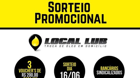 O Sindicato está com inscrições abertas aos sindicalizados para o sorteio promocional de três vouchers individuais, no valor de R$ 200 cada, a ser utilizado como desconto máximo em qualquer um dos serviços oferecidos (veja relação abaixo) pela Local Lub Troca de Óleo e Mecânica Rápida. O sorteio será no dia 16 de junho e os ganhadores têm o prazo de 5 (cinco) dias úteis para retirar os vouchers. A utilização deverá ser feita dentro de 180 dias.