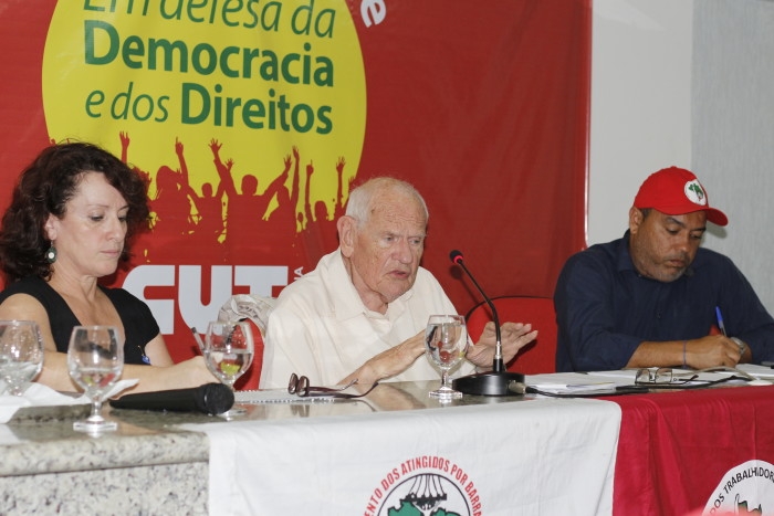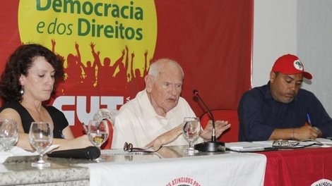 Promovido pela Frente Brasil Popular e pelo MST, debate sobre democracia e lutas populares na América Latina lotou o auditório Adelino Cassis, localizado na CUT Brasília, na noite da última quinta-feira (28). A atividade contou com a participação do sociólogo e filósofo belga François Houtart, um dos idealizadores do Fórum Social Mundial, além de padre adepto da teologia da libertação. O debate também contou com a presença do coordenador nacional do MST, Alexandre Conceição e de outros movimentos comprometidos com a democracia, como Levante Popular da Juventude, Marcha Mundial de Mulheres, Movimento dos Povos da Colômbia e Movimentos Contra Mineração e Barragens.