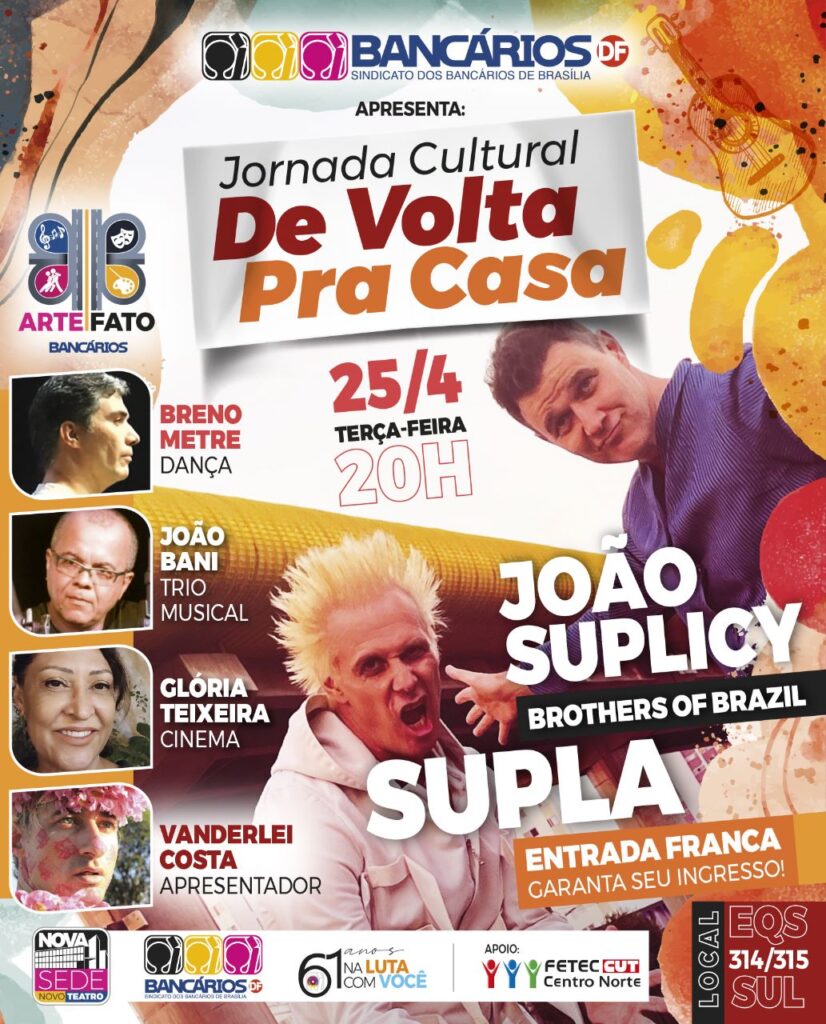 A mistura boa do projeto Arte Fato desembarca nesta terça-feira (25) no palco do Teatro dos Bancários para somar dança, cinema e música à programação da Jornada Cultural ‘De volta pra casa’. As apresentações, que começam às 20h, contam com o trio João Bani, o dançarino Breno Metre e a cineasta Glória Teixeira. Fechando a noite, o duo de irmãos roqueiros Supla e João Suplicy com Brothers of Brazil.