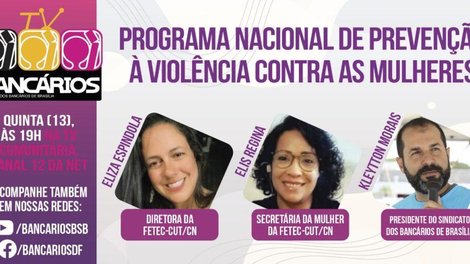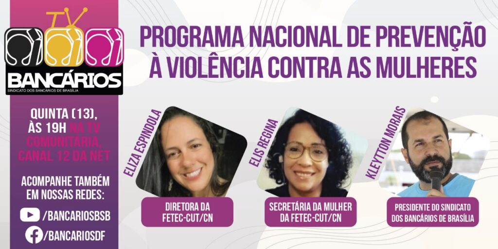 Lançado esta semana, o Programa Nacional de Prevenção à Violência contra as Mulheres marca um importante avanço da categoria bancária na prevenção e acolhimento das vítimas de violência de gênero. A edição desta quinta-feira (13) do TV Bancários aborda a iniciativa com as diretoras da Federação dos Bancários do Centro Norte (Fetec-CUT/CN) Elis Regina e Elizabeth Espindola,e o presidente do Sindicato, Kleytton Morais. O programa vai ao ar às 19h pela TV Comunitária de Brasília e pelas redes sociais do Sindicato.