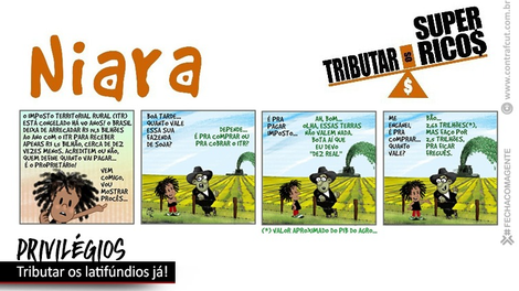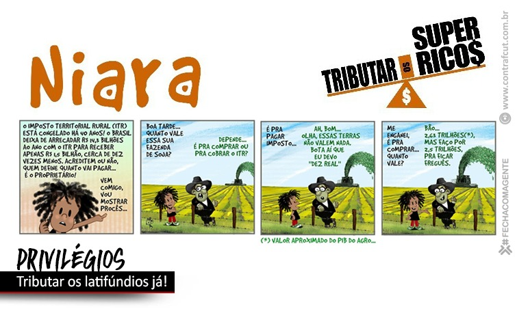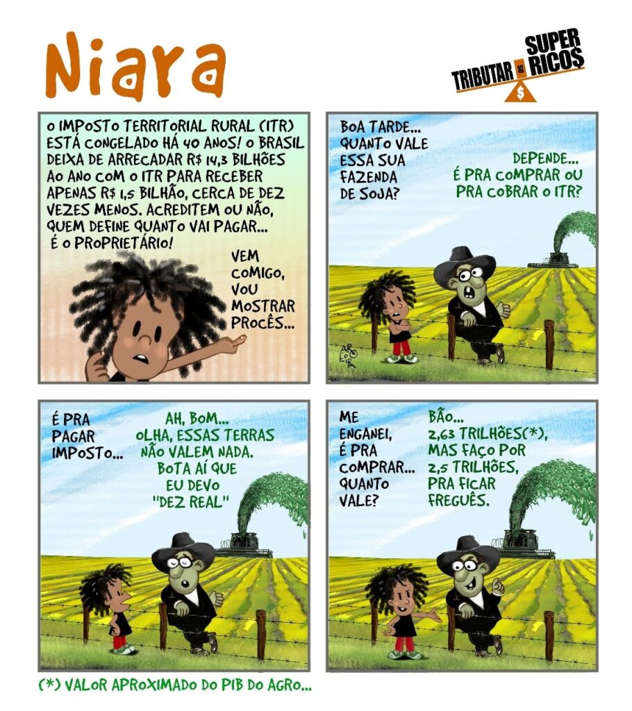Na tirinha, Niara observa que o Brasil deixa de arrecadar R$ 14,3 bilhões por ano de Imposto Territorial Rural (ITR) em decorrência da subvalorização das grandes propriedades rurais (latifúndios). Em seu texto, a RBA informa que “a arrecadação do ITR no Brasil representa menos de 0,1% da receita de tributos da União” e que “as alíquotas do imposto estão congeladas há mais de 40 anos”.