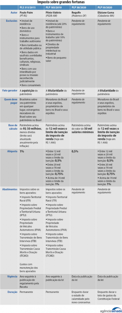 O tema é pauta dos movimentos sociais e sindical há décadas, mas agora, diante da crise mundial de saúde, a taxação das grandes fortunas pode ser a tábua de salvação que minimizará os reflexos do coronavírus no Brasil. Quatro projetos sobre o tema tramitam no Senado, cobrando o que a Constituição Federal já prevê: a instituição de imposto da União sobre grandes fortunas.