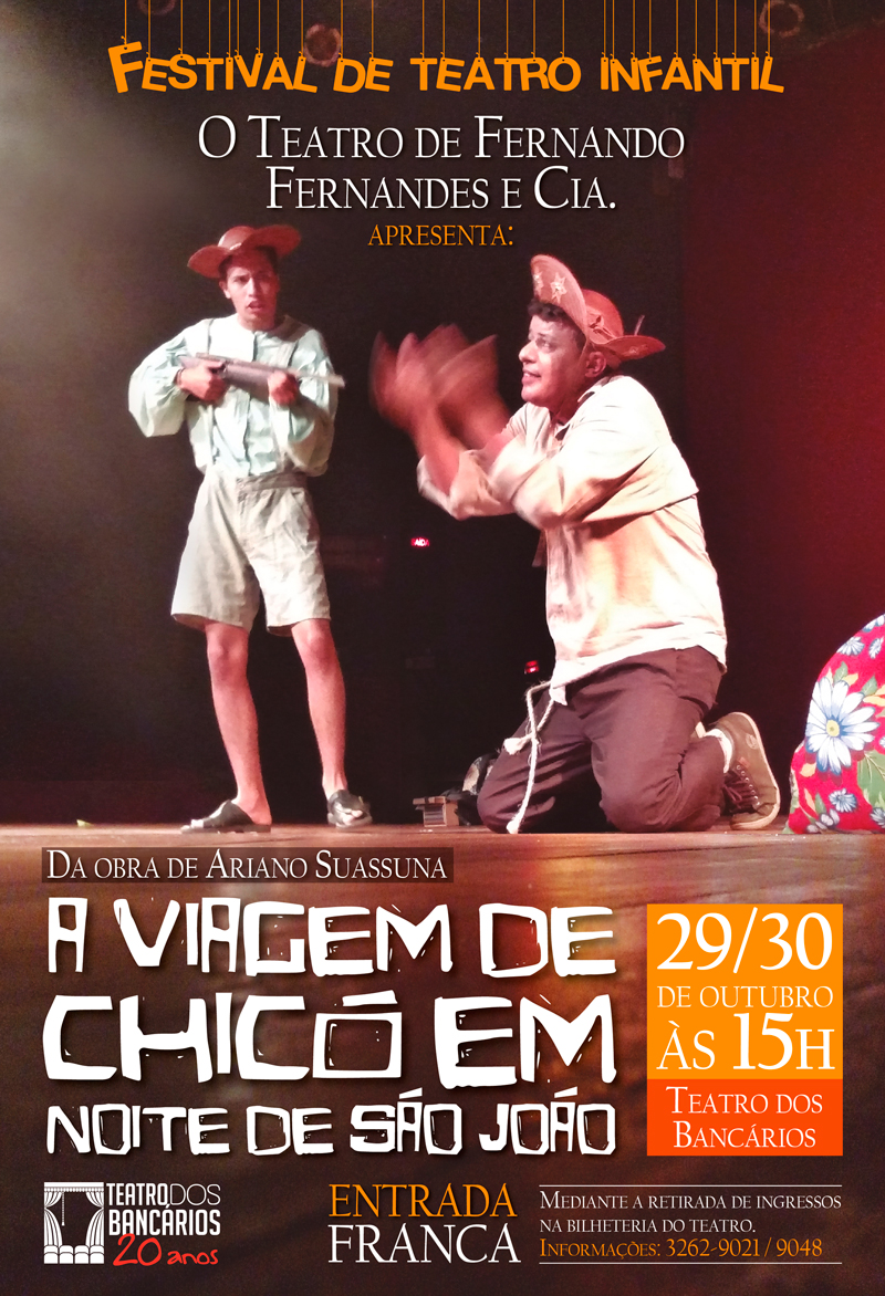 A Viagem de Chicó em Noite de São João retorna ao Teatro dos Bancários, nos dias 29 e 30 deste mês, às 15h, em comemoração ao Dia das Crianças. A peça teatral é uma adaptação da obra de Ariano Suassuna, feita por Fernando Fernandes, que também atua ao lado dos integrantes de sua Cia.