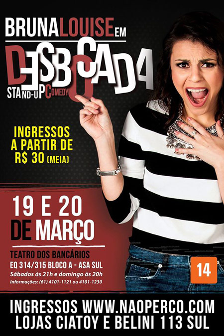 Na onda do ‘stand up comedy’, a humorista Bruna Louise traz para o Teatro dos Bancários, nos dias 19 e 20 de março, o espetáculo ‘Desbocada’. O show de humor fala de situações e queixas que permeiam o universo feminino. Bancários sindicalizados pagam meia-entrada.