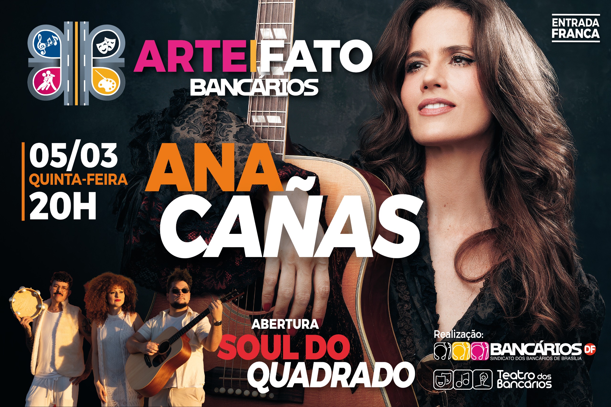 O show será aberto pelo trio Soul do Quadrado, formado por Ana Leana (voz), Kaio Lyra (violão e voz) e Fabyo Guerra (percussão e voz), que é bancário da Caixa Econômica Federal há 13 anos. Além de arquiteto da Caixa, Guerra é compositor, músico e poeta atuante em Brasília.