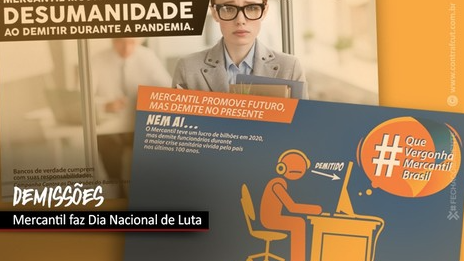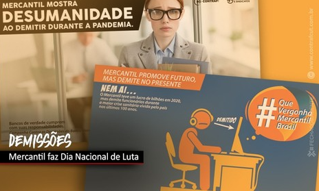 Na segunda quinzena de novembro, o Mercantil do Brasil demitiu mais de 30 funcionários. Para denunciar essa política de demissões é que a COE decidiu fazer as manifestações. Serão realizados atos nas portas das agências do banco, com distribuição de cartas abertas à população, mensagens em carros de som e mobilizações virtuais. “Vamos denunciar a falta de compromisso do banco, que insiste em demitir trabalhadores em plena pandemia e com os lucros nas alturas”, afirmou Marco Aurélio Alves, coordenador da COE do Mercantil.