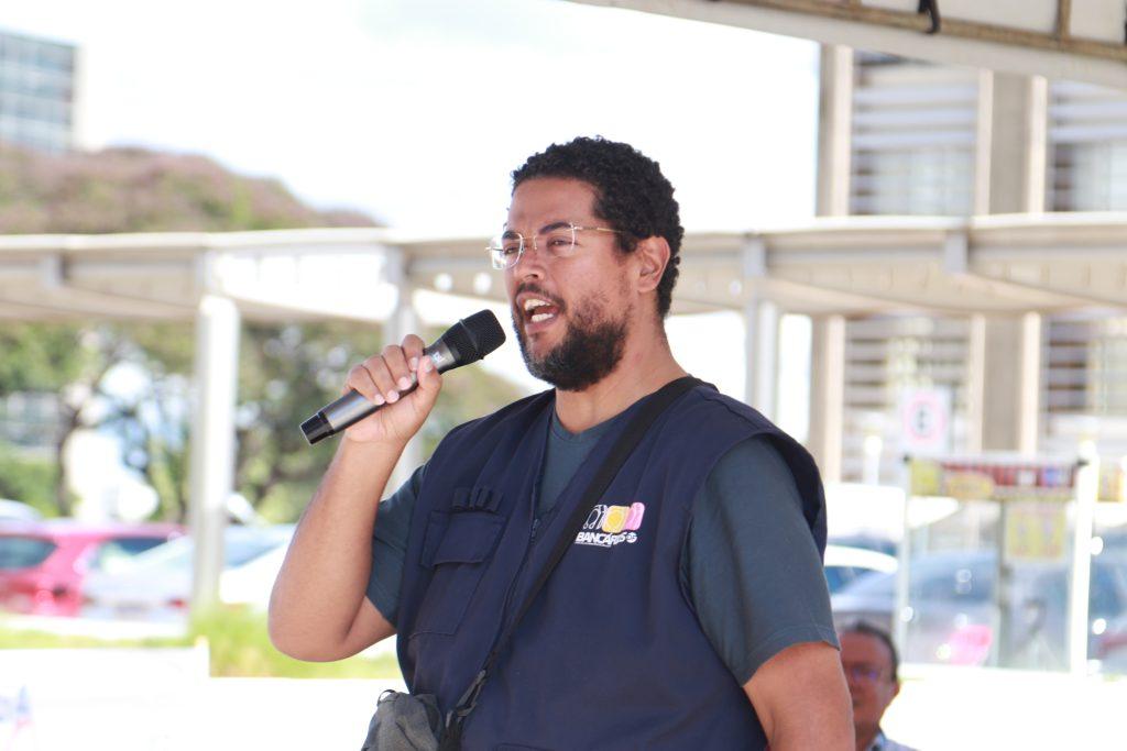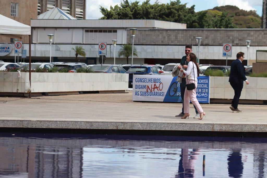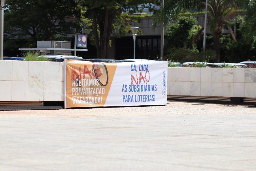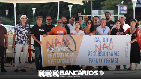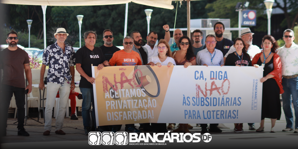 Em mais uma ação contra a proposta de transferência das Loterias para uma subsidiária, o Sindicato realizou um ato, no início da tarde desta segunda-feira (15), em frente ao Matriz I da Caixa, para reforçar a denúncia dessa manobra e exigir que o Conselho de Administração (CA) suspenda novamente essa discussão, que não interessa aos empregados e nem à sociedade.