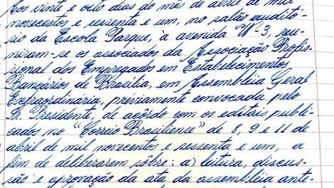 De acordo com a ata da assembleia, escrita à mão (foto acima), o encontro foi realizado no auditório da Escola Parque, na W3 Sul, com a presença de 195 associados. A pauta central tratava de três pontos: a aprovação da ata anterior, a deliberação sobre a transformação da associação em sindicato e a votação dos estatutos da nova entidade. Sob a condução do presidente da mesa, Alvimar Figueira da Fonseca, e com apoio dos secretários Hugsmaer Pelicioni e José Geraldo Alves de Carvalho, os trabalhos transcorreram com ampla participação dos associados.