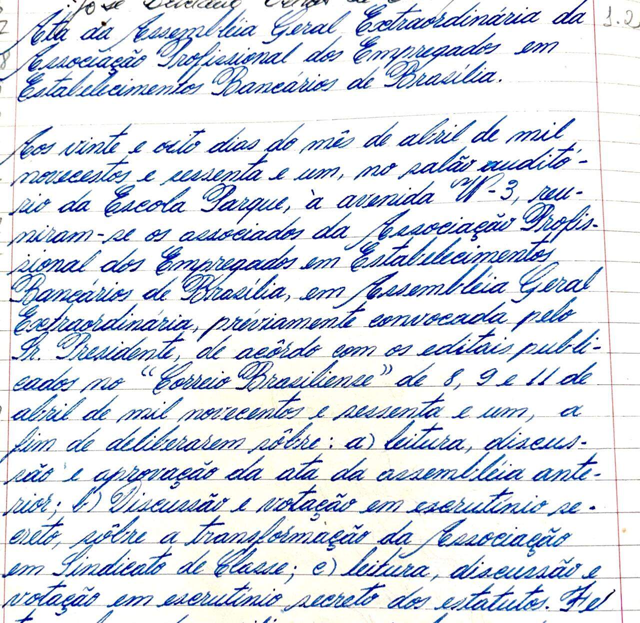 Os bancários de Brasília celebram nesta terça-feira 28 de abril os 65 anos da aprovação da transformação da Associação Profissional dos Empregados em Estabelecimentos Bancários de Brasília em sindicato de classe. A deliberação ocorreu em assembleia geral extraordinária realizada em 28 de abril de 1961, consolidando uma etapa fundamental no processo de institucionalização da representação da categoria.