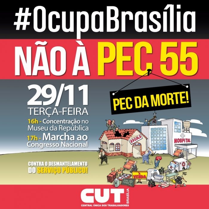 No Congresso, a base aliada do presidente ilegítimo Michel Temer corre contra o tempo para aprovar a Proposta de Emenda à Constituição (PEC) 55, que congela os gastos na Saúde, Educação e outros investimentos sociais durante 20 anos. Nas ruas, o povo, que resiste ao golpe, mostra que não dará arrego a Temer e demais usurpadores de direitos. Nesta terça (29), mais uma prova desta afirmação será dada, nas ruas de Brasília. Trabalhadores, estudantes,