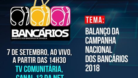 Depois de dezenas de rodadas de negociações geral e específicas, os bancários saíram vitoriosos e encerraram a Campanha Nacional 2018 com a manutenção das cláusulas da Convenção Coletiva de Trabalho. Nesta sexta-feira (7), às 14h30, você confere a avaliação dos resultados das negociações com a Fenaban, o Banco do Brasil, Caixa e BRB no programa TV Bancários na TV Comunitária.