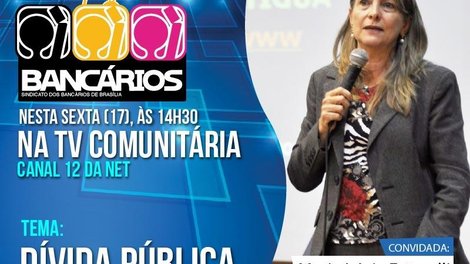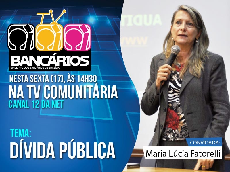 O programa TV Bancários recebe, nesta sexta (17), a auditora aposentada da Receita Federal Maria Lúcia Fatorelli para falar sobre dívida pública. O programa será exibido ao vivo, a partir das 14h30, pela TV Comunitária (canal 12 da Net), pelo portal do Sindicato e da CUT Brasília.