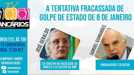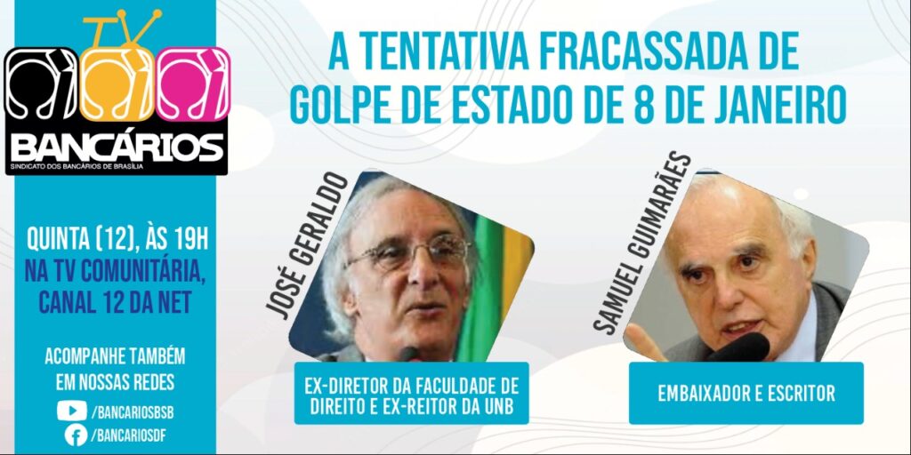 “A tentativa fracassada de golpe de Estado de 8 de janeiro, o terror nas sedes dos Três Poderes e o complô dos militares” é o assunto em pauta no TV Bancários desta quinta-feira (12), pela TV Comunitária de Brasília, de 19h às 20h.