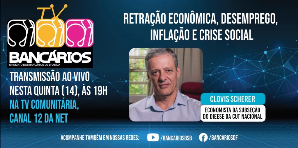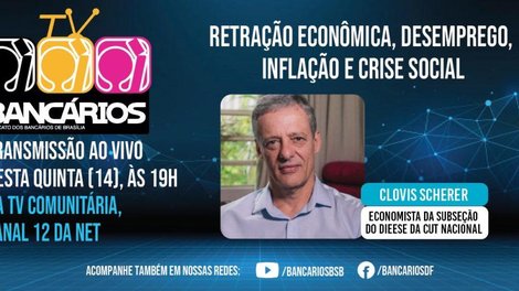 O TV Bancários desta quinta-feira, 14 de outubro, discute a difícil conjuntura econômica que combina queda nas projeções para o Produto Interno Bruto (PIB), desemprego, inflação em alta e degradação das condições de vida dos brasileiros. O convidado do programas é Clóvis Scherer, economista da Subseção Dieese da CUT Nacional.
