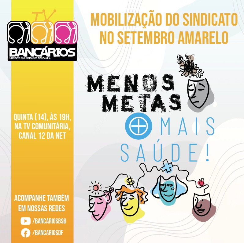 A TV Bancários na TV Comunitária desta quinta-feira (14) traz a mobilização do Sindicato nos bancos e nas ruas chamando a atenção dos bancários e da população para o Setembro Amarelo, mês de conscientização sobre a prevenção do suicídio e pela valorização da vida.