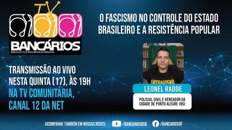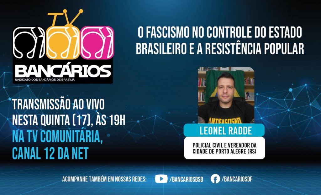 O TV Bancários desta quenta-feira (17) tem como tema “O fascismo no controle do Estado brasileiro e a resistência popular”. O convidado para debater o assunto é o vereador da cidade de Porto Alegre (RS) Leonel Radde. Será às 19h, ao vivo, pela TV Comunitária (canal 12 da Net) e pelas redes sociais do Sindicato youtube.com/bancariosbsb e facebook.com/bancariosdf.