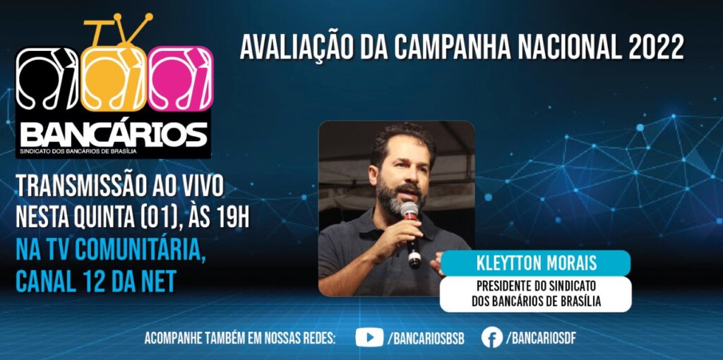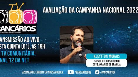 O TV Bancários vai ao ar de 19h às 20h, com transmissão pela TV Comunitária de Brasília (canal 12 da Net) e pelas redes sociais do Sindicato.