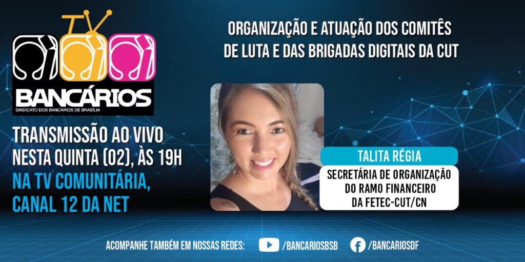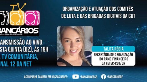 O TV Bancários desta quinta-feira (2) trata do tema ‘Organização e atuação dos Comitês de Luta e das Brigadas Digitais da CUT`, com Talita Regia da Silva, secretária Social e Cultural do Sindicato dos Bancários de Brasília.
