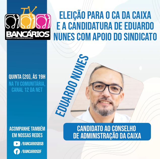 O TV Bancários desta quinta-feira (20) debate a eleição para o Conselho de Administração da Caixa e a candidatura de Eduardo Nunes com apoio do Sindicato. A votação ocorre de 24 a 27 de abril, pela Internet Caixa.