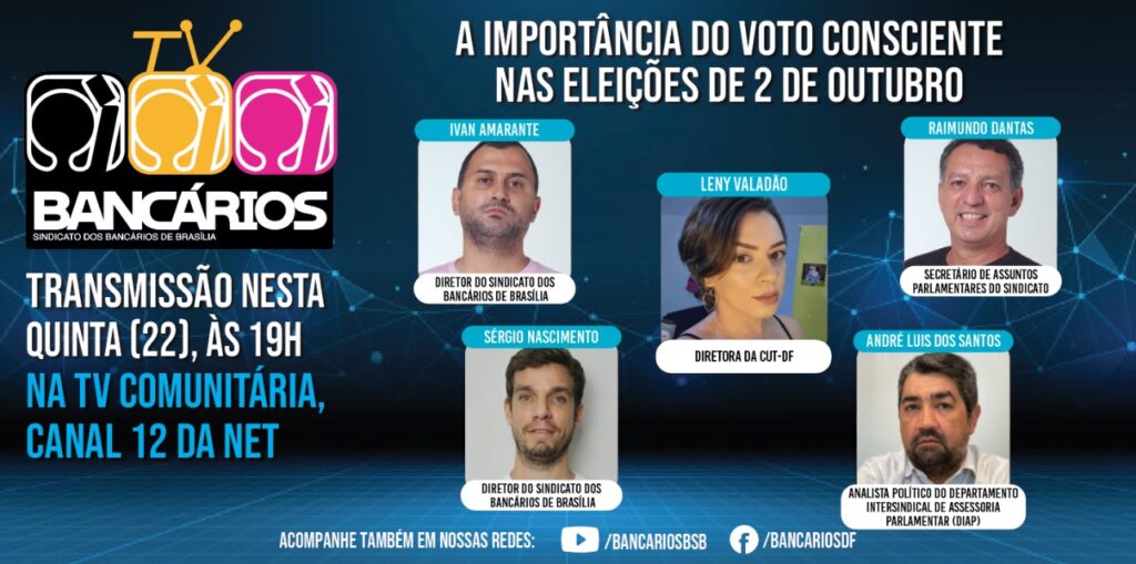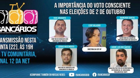O TV Bancários vai ao ar às quintas-feiras, às 19h, pela TV Comunitária de Brasília (canal 12 da Net) e pelas redes sociais do Sindicato.