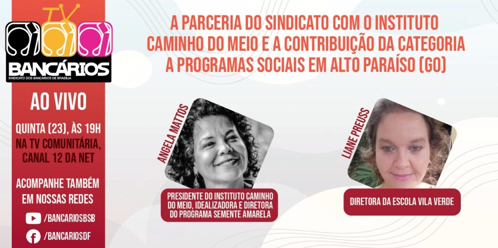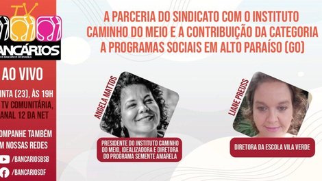 O programa TV Bancários que vai ao ar nesta quinta-feira (23) tem como tema “A interação do Sindicato com o Instituto Caminho do Meio e a contribuição da categoria bancária a programas sociais em Alto Paraíso (GO)”.