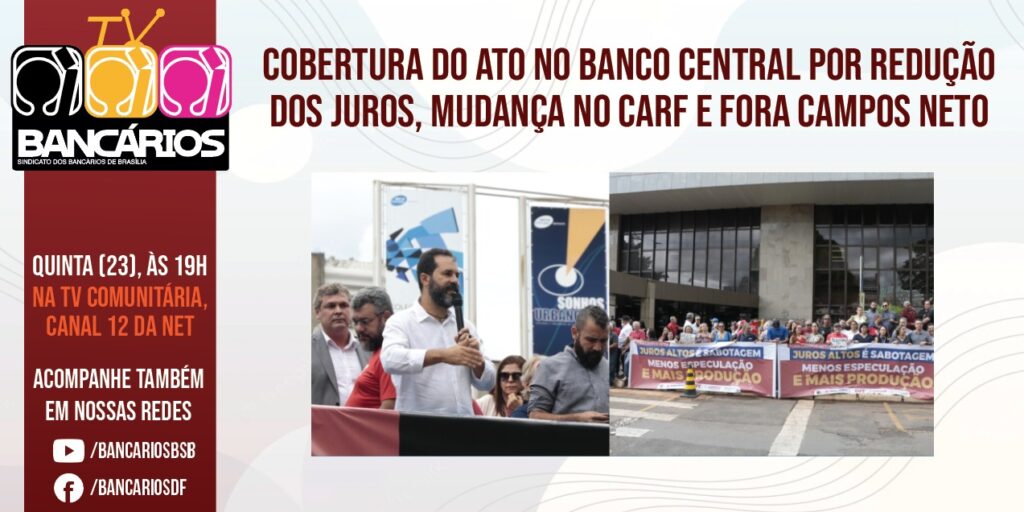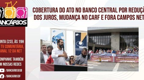 O TV Bancários desta quinta-feira (23) mostra um compacto da cobertura do ato na sede do Banco Central, em Brasília, por redução da taxa de juros, por mudança na composição e gestão do Conselho de Administração de Recursos Fiscais (CARF) e pela saída de Roberto Campos Neto da presidência do BC.