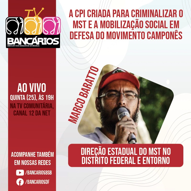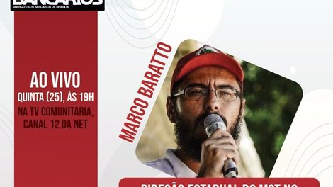 O programa tem como convidado Marco Baratto, membro da Direção Estadual do MST no Distrito Federal e Entorno, e vai ao ar às 19h com transmissão ao vivo pela TV Comunitária de Brasília (canal 12 da Net) e pelas redes sociais do Sindicato.