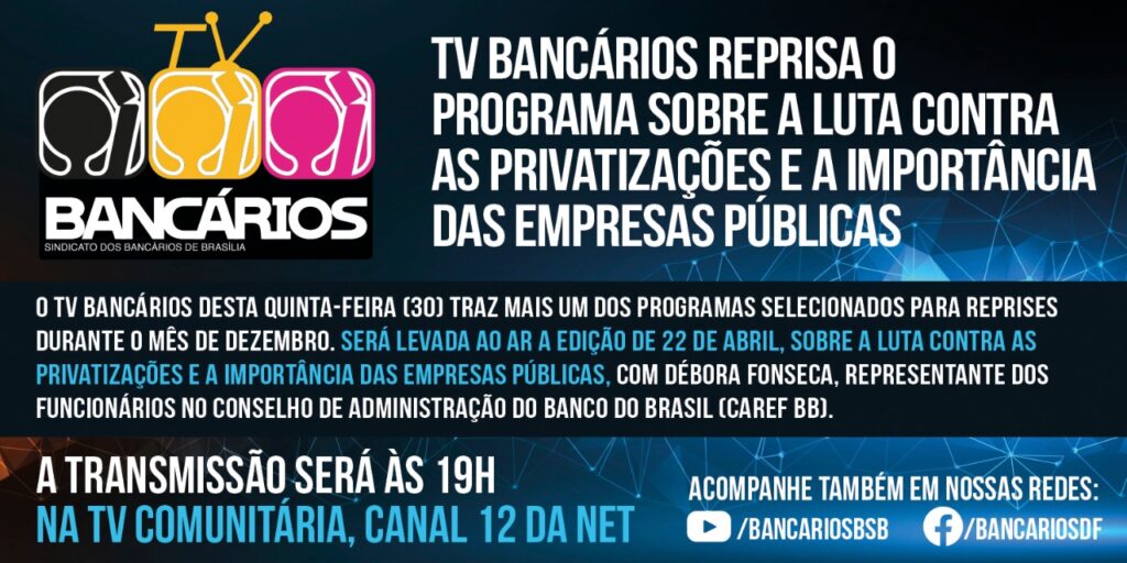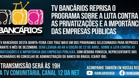 O TV Bancários desta quinta-feira (30) traz mais um dos programas selecionados para reprises durante o mês de dezembro. Será levada ao ar a edição de 22 de abril, sobre a luta contra as privatizações e a importância das empresas públicas, com Débora Fonseca, representante dos funcionários no Conselho de Administração do Banco do Brasil (Caref BB).
