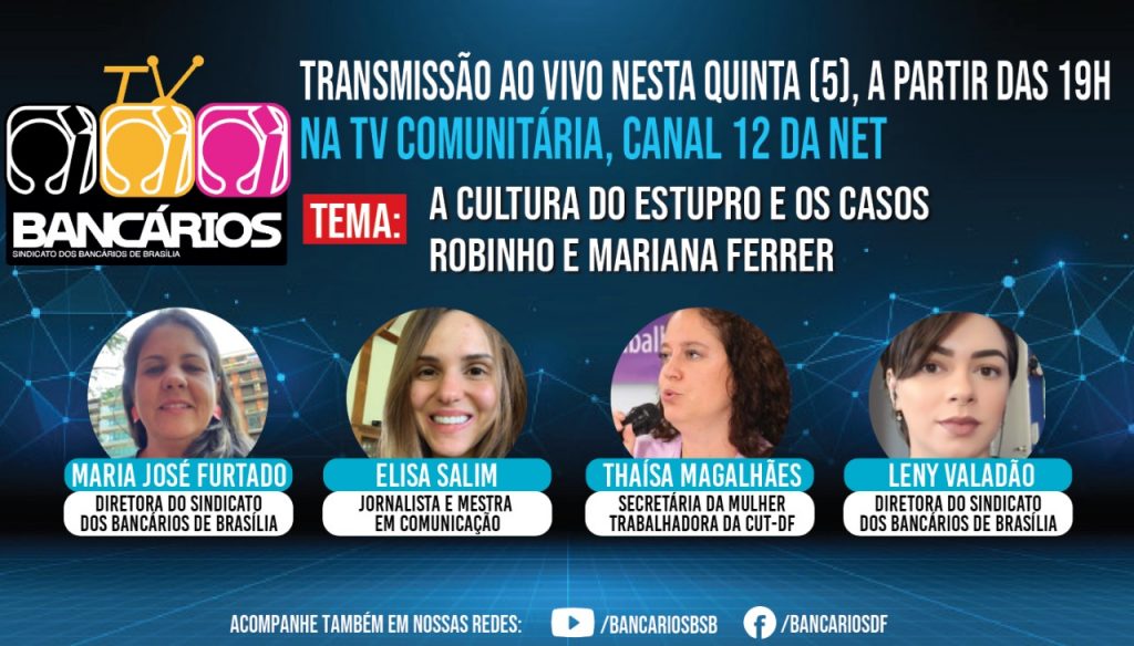 No mês de combate à violência contra a mulher, o TV Bancários discute a cultura do estupro e os casos da influenciadora digital Mariana Ferrer e do jogador de futebol Robinho. Na edição desta quinta-feira (5), que vai ao ar às 19h, o programa será apresentado e mediado pela secretária de Mulheres do Sindicato, Zezé Furtado. Para acompanhar esta edição, basta se conectar às redes sociais do Sindicato ou pela TV Comunitária de Brasília (canal 12 da Net).