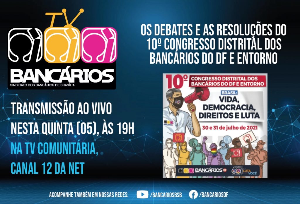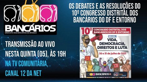 O programa TV Bancários desta quinta-feira (5) destacará os principais momentos dos debates ocorridos durante o 10º Congresso Distrital dos Bancários e Bancárias do DF e Entorno, na noite do dia 30 e no decorrer do dia 31 de julho. O evento definiu as prioridades e o plano de lutas da categoria para o próximo período e elegeu delegados para a Conferência Nacional e para os congressos específicos por bancos.