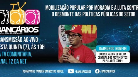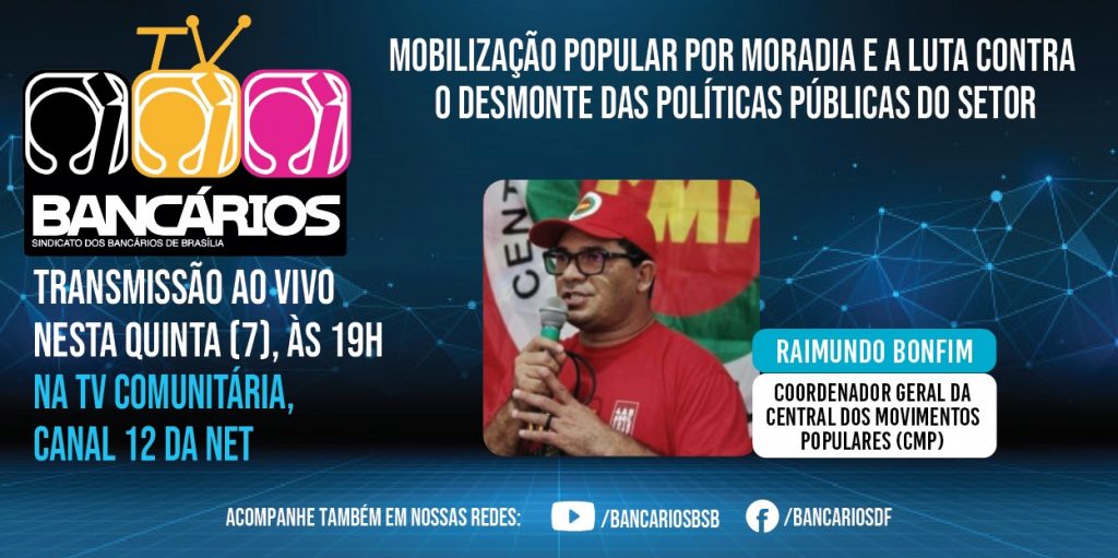 O programa TV Bancários desta quinta-feira (7) recebe Raimundo Bonfim, coordenador-geral da Central dos Movimentos Populares (CMP), para falar sobre a mobilização popular por moradia e da luta contra o desmonte das políticas públicas promovido pelo governo Bolsonaro para o setor.