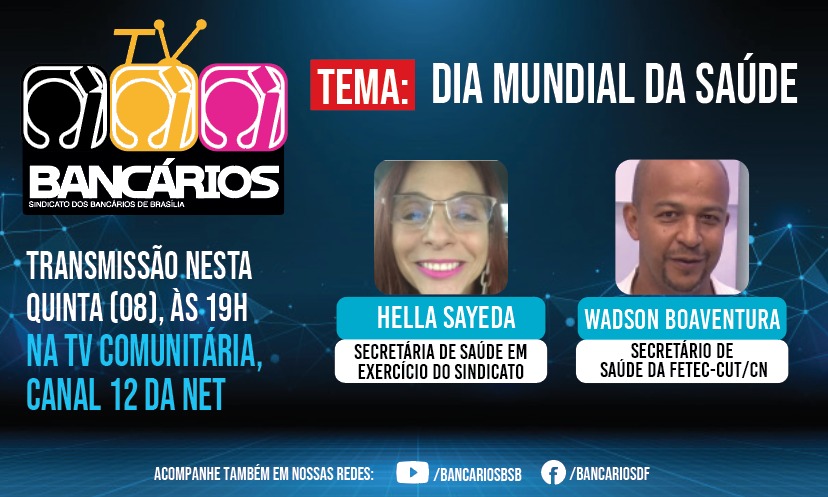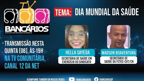 O Dia Mundial da Saúde, comemorado nesta quarta-feira (7), será o tema da edição do programa TV Bancários. Os convidados desta edição, que vai ao ar nesta quinta (8) são a secretária de Saúde em exercício do Sindicato, Hella Sayeda, e o secretário de Saúde da Federação Centro Norte (Fetec-CUT/CN). A apresentação será do secretário de Imprensa do Sindicato, Rafael Zanon.