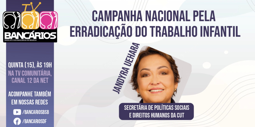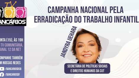 O TV Bancários desta quinta-feira (15) busca impulsionar e reforçar a campanha do Fórum Nacional de Prevenção e Erradicação do Trabalho Infantil e Proteção ao Adolescente Trabalhador (FNPETI), que conta com a participação da Central Única dos Trabalhadores (CUT), do Ministério Público do Trabalho (MPT), da Justiça do Trabalho e da Organização Internacional do Trabalho (OIT).