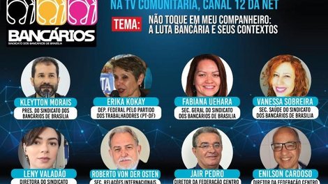 Os convidados para o debate são o presidente do Sindicato, Kleytton Morais; a secretária-geral, Fabiana Uehara; a secretária de Saúde, Vanessa Sobreira e a diretora Leny Valadão; e Enilson Cardoso e Jair Pedro, diretores da Federação dos Bancários do Centro Norte (Fetec-CUT/CN). Também são convidados a deputada federal Erika Kokay (PT-DF) e o secretário de Relações Internacionais da Contraf-CUT, Roberto von der Osten, o Betão.