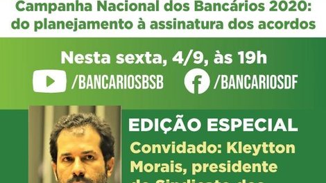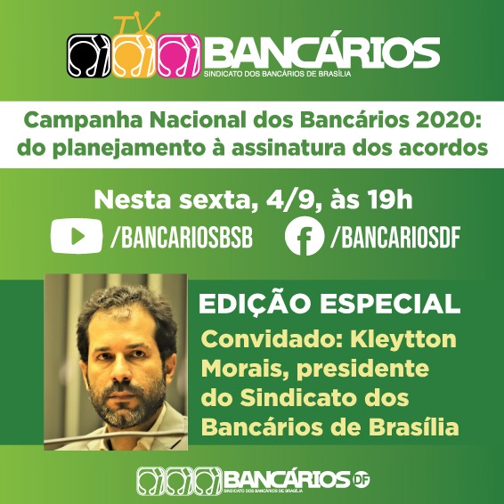 O TV Bancários desta sexta-feira (4) recebe o presidente do Sindicato e integrante do Comando Nacional, Kleytton Morais, para uma conversa sobre o processo histórico da Campanha Nacional dos Bancários 2020. O programa vai ao ar a partir das 19h pelas redes sociais do Sindicato e da TV Comunitária de Brasília (canal 12 da Net).