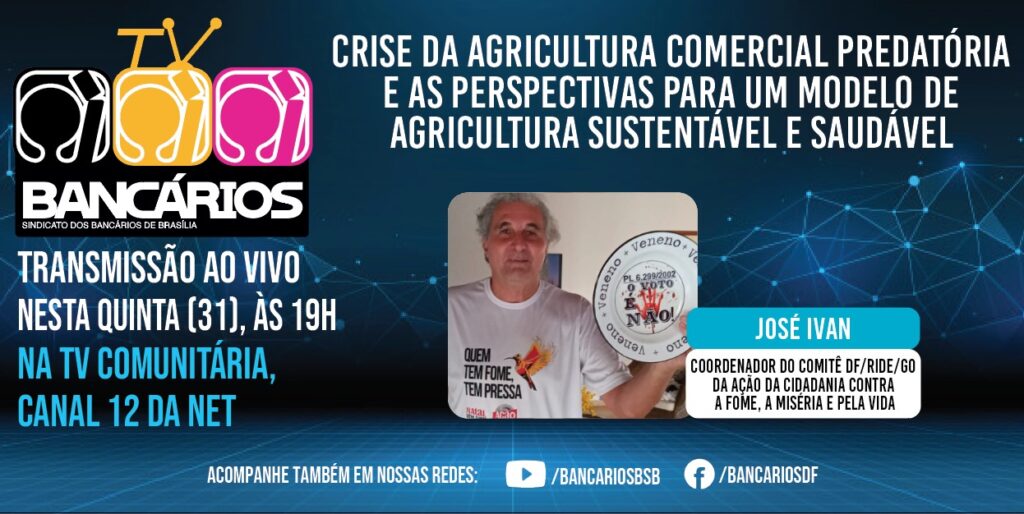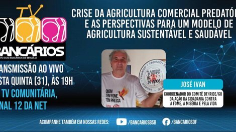 O TV Bancários desta quinta-feira (31) aborda os impactos e as crises do agronegócio predatório e discute as perspectivas para um modelo de agricultura sustentável e saudável. O convidado do programa é José Ivan, coordenador do Comitê DF/RIDE/GO da Ação da Cidadania Contra a Fome, a Miséria e Pela Vida e presidente do Conselho de Segurança Alimentar e Nutricional do Distrito Federal (CONSEA/DF).
